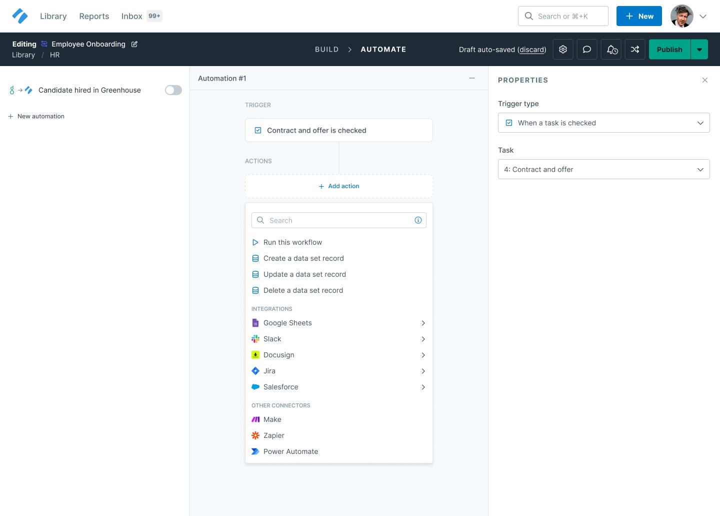 Workflow Generation: Designed a guided prompt flow where a simple input (e.g., “new hire onboarding”) produced a full workflow with steps, assignees, due dates, and automations. Ensured outputs were editable so users stayed in control.